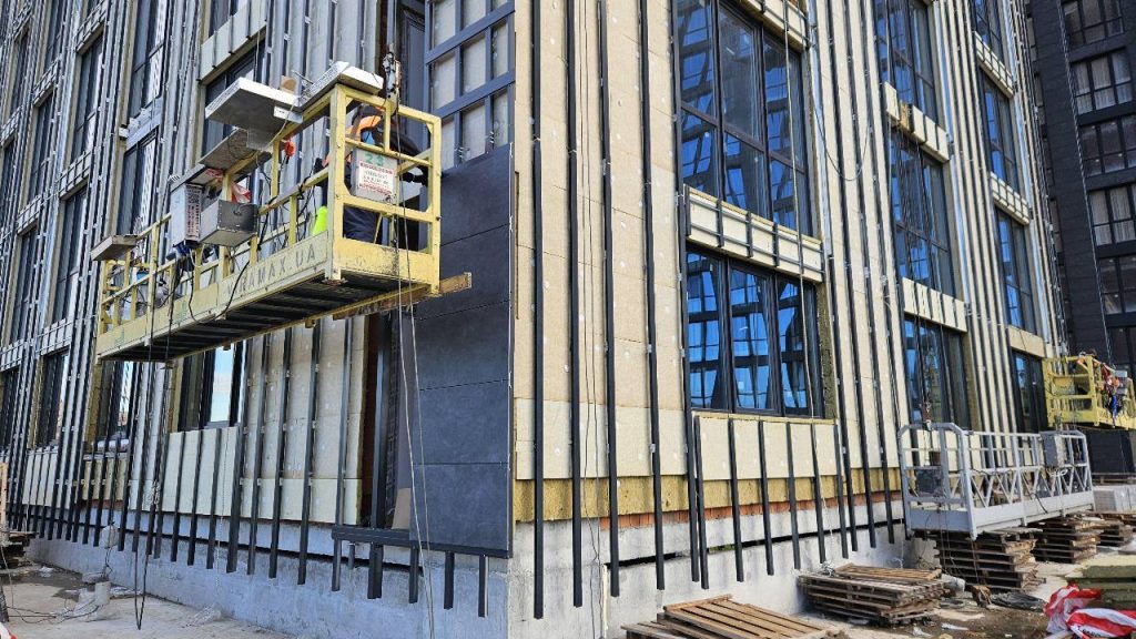 - Монтаж металевого каркасу вентильованого фасаду (торець від будинку 2) – 96%